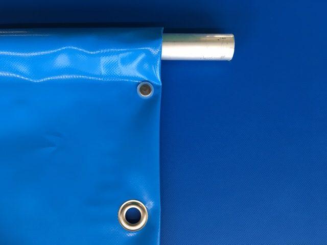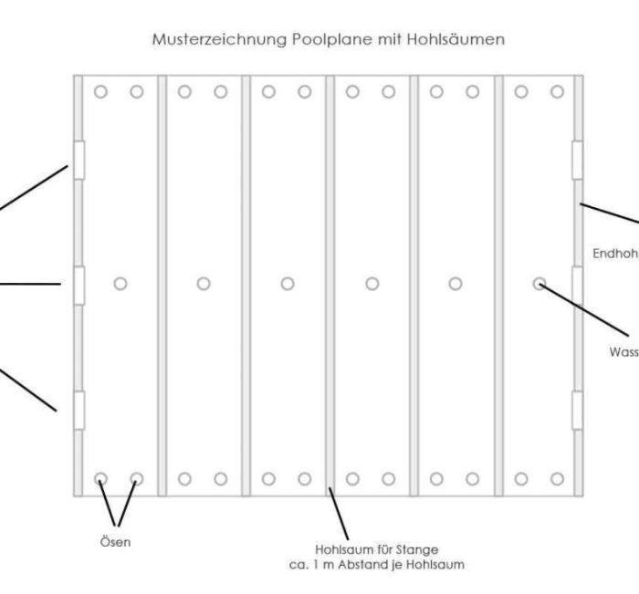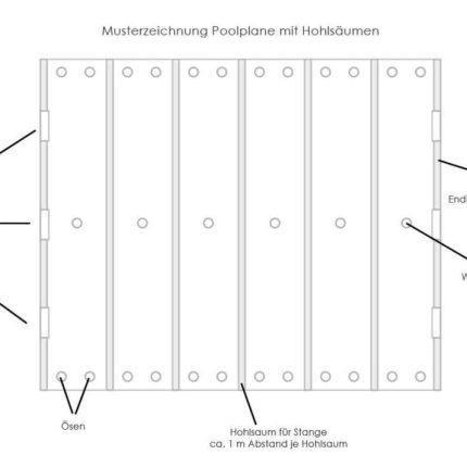 - Einschublaschen (End-Hohlsäume) am Anfang und am Ende der Poolplane (= Breite) für eine Stange mit ca. 45 mm Ø, gesichert durch Nieten für mehr Belastbarkeit (siehe Bild)